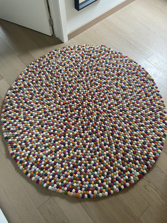 Dale un toque de color a tu espacio con la alfombra Pinocho de HAY. Con 140 cm de diámetro, esta vibrante pieza está confeccionada con lana de alta calidad y presenta un divertido estampado de bolas de fieltro multicolor. Perfecta para añadir calidez y textura a cualquier habitación.