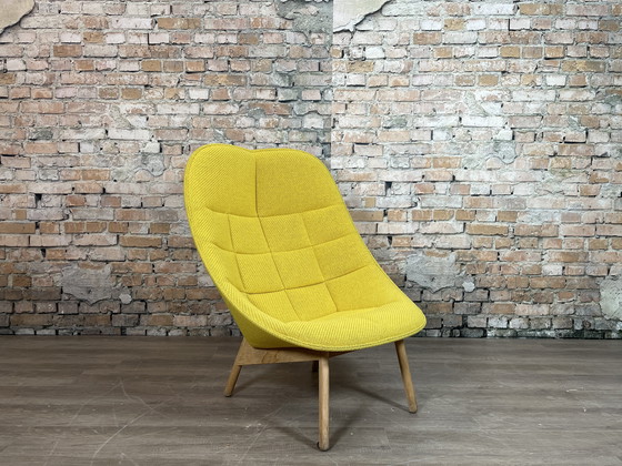 El sillón Uchiwa amarillo es un diseño de Doshi Levien para la marca HAY. El sillón Uchiwa es un sillón generoso y cómodo inspirado en la forma de un abanico japonés.