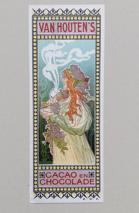 Henri Privat-Livemont - Cacao y Chocolate de Van Houten - Van Houten - 1897 - Marcapáginas - 6 x 16,5 cm. Marcapáginas publicitario finisecular del fabricante de chocolate con diseño Art Nouveau (una mujer con una taza de chocolate caliente en la mano); cromolito del artista belga Henri Privat-Livemont (1861-1936). Pieza de colección de museos (el Museo Stedelijk de Ámsterdam, entre otros, tiene un ejemplar). Compradores fuera de Países Bajos: se aplican otras tarifas de envío.