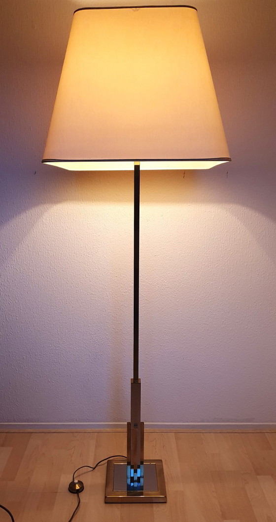 Lámpara de pie de diseño Hollywood Regency de Herda Amsterdam en el llamado estilo rascacielos. La lámpara está hecha de latón brillante y cromo y tiene dos fuentes de luz que se encienden y apagan simultáneamente con un interruptor de pie. Es probable que la lámpara conserve la pantalla original.