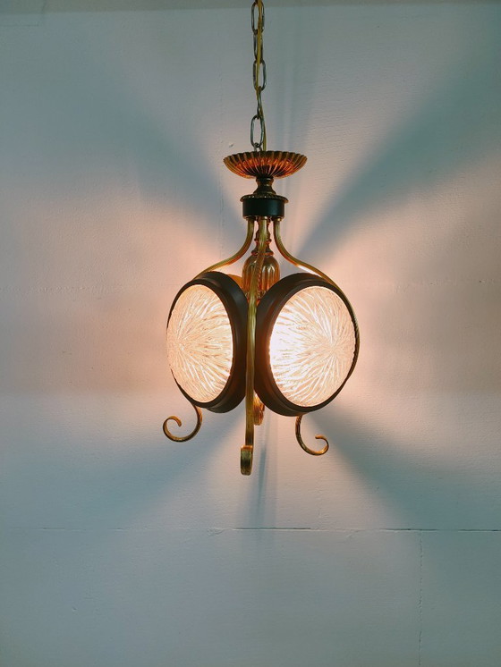 Preciosa lámpara de techo/candelabro de la década de 1960. Un adorno de latón con cuatro pantallas redondas de vidrio tallado que difunden la luz con gran belleza. En general, impecable y funcionando. Incluye un rosetón de latón. El latón puede desgastarse ligeramente con el paso de los años.