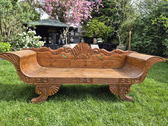 Este precioso banco antiguo de Indonesia es un verdadero atractivo tanto para interiores como para exteriores. Su tallado artesanal en madera y su rico tono marrón le confieren un aspecto cálido y auténtico. Ideal para quienes buscan una pieza única que aporte estilo e historia a cualquier espacio.