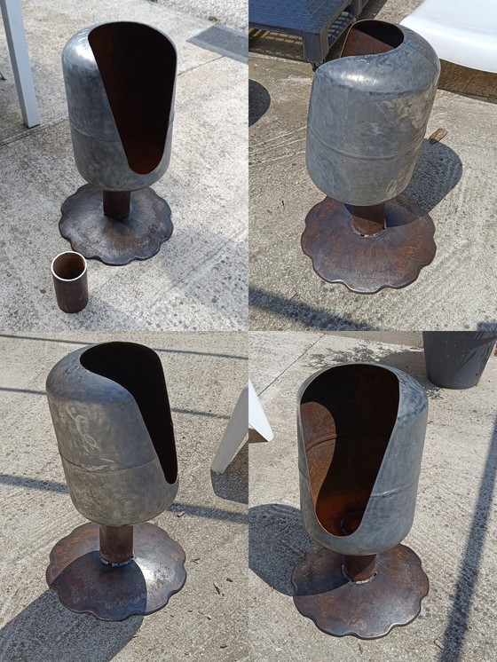 Este pozo de fuego está esculpido a partir de una bombona de gas de 13 kg reutilizada, montada sobre un tubo de acero de 10 cm de diámetro (20 cm de altura), anclado en un disco de granja abovedado utilizado antaño para arar. Una base cruda y floral se une a una masa industrial pura.