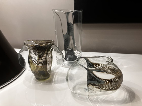 4 hermosos artículos de regalo de arte en vidrio del artista alemán Hubert Koch Tamaños 10x13 cm, 12x14 cm, 10x20 cm, 12x20 cm en vidrio transparente con tinte gris / verde. Todos hechos a mano, en Alemania. Famoso artista del vidrio.