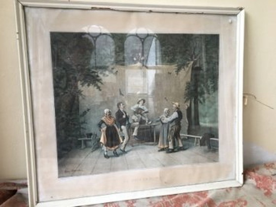 Una lámina muy decorativa y evocadora de Jean Moreau, titulada "En avant la musique" (Avant la musique). Fecha: 1890, Francia. Representa una celebración con baile y música, una escena alegre y muy evocadora. En un marco antiguo con cristal, es una hermosa manera de crear un ambiente evocador. Perfecta para su B&B o casa de huéspedes, para que respire un aire francés. Ancho: 65 cm. Alto: 57 cm.