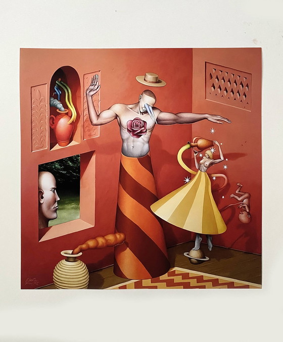 Impresión "Habitación Roja" de Waone Interesni Kazki. Dimensiones: 40,60 x 40,65 cm. 2022 para la revista Juxtapoz. Esta impresión de Juxtapoz, de lanzamiento programado, solo estuvo disponible en línea por un breve periodo. Edición abierta (sin firmar ni numerar).