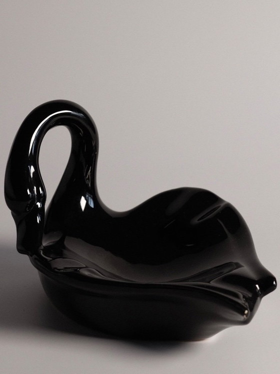 Un impresionante Cisne Negro de mediados de siglo/Art Déco. Fabricado en cerámica con acabado esmaltado en negro. Una pieza versátil que funciona perfectamente como joyero, jabonera o cenicero.