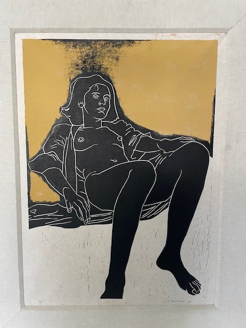 Extraordinaria obra gráfica del artista holandés Jan Boetzkes, titulada "La Mañana Después", creada en 1981. Esta expresiva litografía presenta líneas potentes, casi crudas, sobre un fondo amarillo ocre, lo que le confiere un fuerte impacto visual y emocional. Se trata del segundo ejemplar de una edición muy limitada de solo tres ejemplares, firmado a mano por el artista en la esquina inferior derecha: una pieza de coleccionista excepcional y valiosa. La obra está montada sobre el cartón original y se entrega con el paspartú original. El paspartú presenta algunas manchas y el papel presenta un ligero desgaste en la parte superior. Por lo demás, la obra se encuentra en buen estado. Dimensiones (incluido el paspartú): 72,5 cm de ancho x 92,5 cm de alto. La obra se encuentra actualmente sin enmarcar, lo que le permite enmarcarla profesionalmente a su gusto y estilo, para que pueda exhibirla en todo su esplendor. Debido a su tamaño, solo se puede recoger o enviar por mensajería como Brenger. Una obra excepcional y conmovedora para el coleccionista de gráficos holandeses o el amante del arte figurativo expresivo.