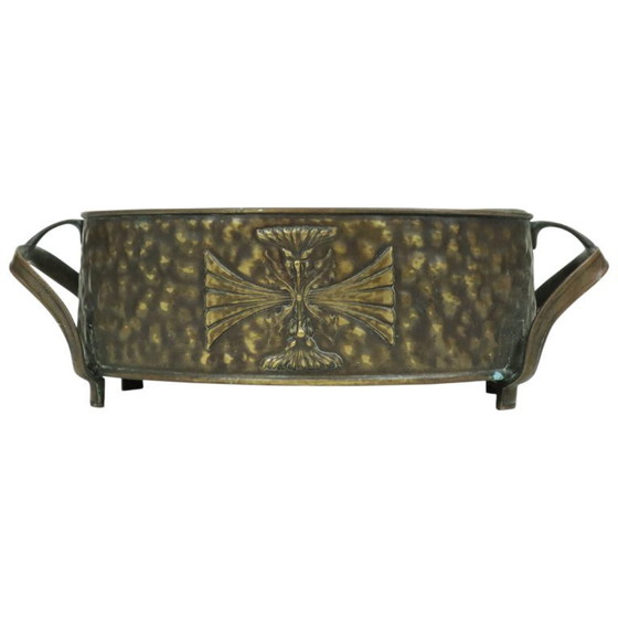 Este macetero antiguo es muy decorativo, típico del estilo Art Nouveau. Los elementos florales y orgánicos son centrales, con elegantes asas curvas que se integran en las patas. En el centro, se encuentra un detallado motivo en forma de cruz con elementos estilizados florales o en forma de hoja. El conjunto presenta una hermosa pátina propia del tiempo.