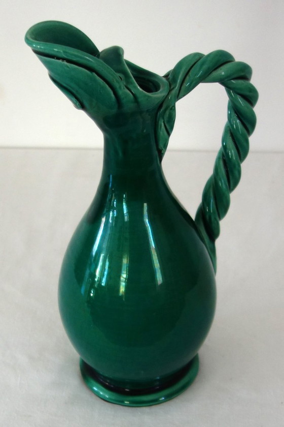 Jarra grande o aguamanil de estilo "demoiselle d'Avignon" de la década de 1960, Vallauris. Hermoso color verde en cerámica vidriada. Asa retorcida. En perfecto estado. Altura 30 cm. Envío con cuidado.