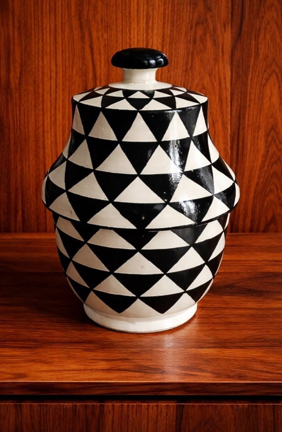 Jarra o tarro grande con tapa con estampado de arlequín.