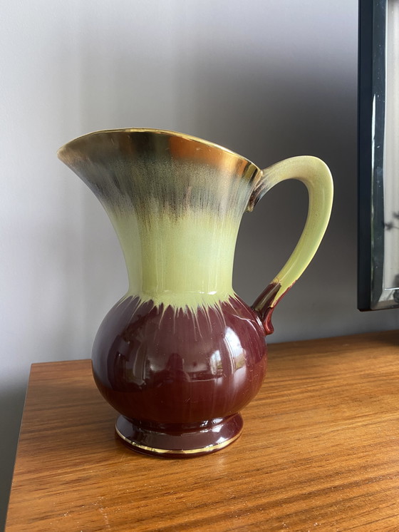 Fabricado en la década de 1950 en Alemania Occidental, este jarrón antiguo de cerámica vintage tiene una cautivadora paleta de colores en tonos dorados, burdeos y amarillo cremoso mantequilla. Conserva la etiqueta original de Bay Keramik.