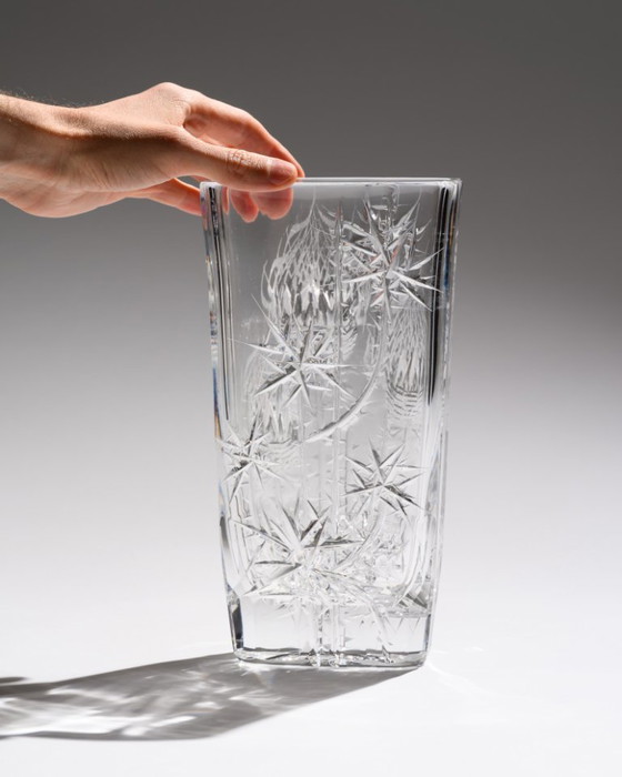 El cuerpo de cristal de plomo macizo realza el efecto óptico, refractando la luz a través de facetas de corte nítido y líneas finamente grabadas. El jarrón se presenta simultáneamente como un objeto decorativo y como un estudio de técnica, equilibrando densidad, claridad y luminosidad.