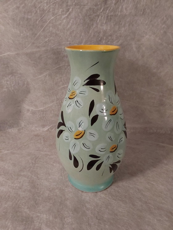 Este hermoso jarrón de Alemania Occidental, modelo 532-25, es un magnífico ejemplo de cerámica vintage. Presenta un suave tono azul con un llamativo interior amarillo, creando un contraste alegre. Los motivos florales pintados a mano añaden un toque de elegancia y encanto a esta pieza única.