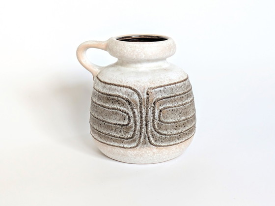 Jarrón vintage redondo de cerámica, fabricado por el fabricante alemán VEB Haldensleben en la década de 1960. Presenta un esmaltado blanco roto mate adornado con un patrón geométrico en relieve de color marrón claro y textura rugosa. Tiene una pequeña asa redondeada en la parte superior. El número de modelo 4128 está marcado en la parte inferior, aunque se ha descolorido. Una magnífica pieza de cerámica de mediados de siglo que se adapta a diversos interiores gracias a su paleta neutra y su decoración modernista a la vez que atemporal. Altura: 15,5 cm. Diámetro: 13,5 cm. Estado: Excelente estado vintage sin signos de desgaste significativos. Ver fotos para más detalles.