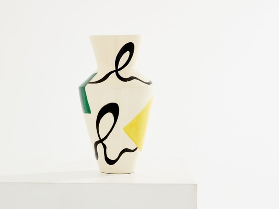 Este jarrón alto y colorido de cerámica vidriada fue diseñado y producido por Roland Brice en la década de 1950 en su taller de Biot, una pequeña ciudad cerca de Vallauris, en el sur de Francia. Roland Brice fue alumno de Fernand Léger. Se convirtió en su amigo íntimo y ceramista a partir de 1949, produciendo numerosas obras de arte en su taller de Biot hasta finales de la década de 1960, mientras exploraba creaciones propias inspiradas en la obra de Fernand Léger. Esta pieza de colección se encuentra en perfecto estado.