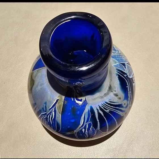 Este precioso jarrón Leloup es una obra maestra del soplado de vidrio, con un profundo tono azul que atrae la mirada y emana una estética refinada. El jarrón está adornado con delicados motivos que recuerdan las líneas fluidas del estilo Art Nouveau, convirtiéndolo en una pieza elegante y atemporal que se adapta a cualquier interior.