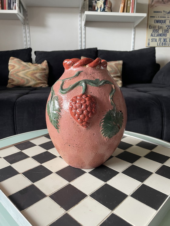 Jarrón de terracota esmaltada artesanal. Detalles en relieve, decoración de fresas y hojas de fresa. Sutiles tonos rosa pirita, rojo y verde. Cuello en relieve de cuerda torneada. Un jarrón único, vintage y tremendamente moderno a la vez. Perfectamente imperfecto. Las fotos dan fe de su estado, sin astillas ni grietas. Diámetro de la base: 9 cm // Diámetro en el punto más ancho: 16 cm // Altura: 25 cm // Diámetro del cuello: 9,5 cm