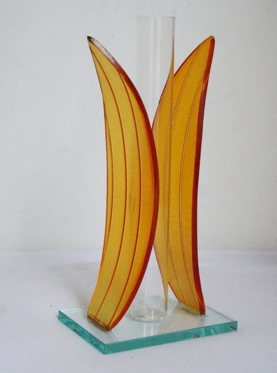 Las secciones de vidrio ámbar presentan una textura con delicadas nervaduras verticales y una elegante silueta en forma de vela. Toda la estructura está montada sobre un pesado zócalo rectangular de vidrio transparente, que proporciona una base estable y minimalista. Su transparencia le permite jugar con la luz, convirtiéndolo en una pieza perfecta para un aparador, una repisa o un alféizar.