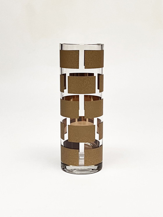 Este jarrón es uno de los primeros producidos en la colección creada por Sottsass Associati para Egizia. Un hermoso jarrón de vidrio soplado de doble espesor, serigrafiado manualmente en esta versión especial en oro granulado de 24 quilates, se produjo para conmemorar los 50 años de producción de Egizia (15/12/1999). En la versión original, la serigrafía era en plata granulada.