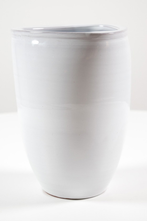 Jarrón Utrecht Nightingale. Jarrón cilíndrico con tapa triangular redondeada. Diseño holandés en esmalte blanco de alto brillo. El jarrón está marcado. Presenta una pequeña grieta en el borde de la tapa, pero por lo demás se encuentra en buen estado vintage.