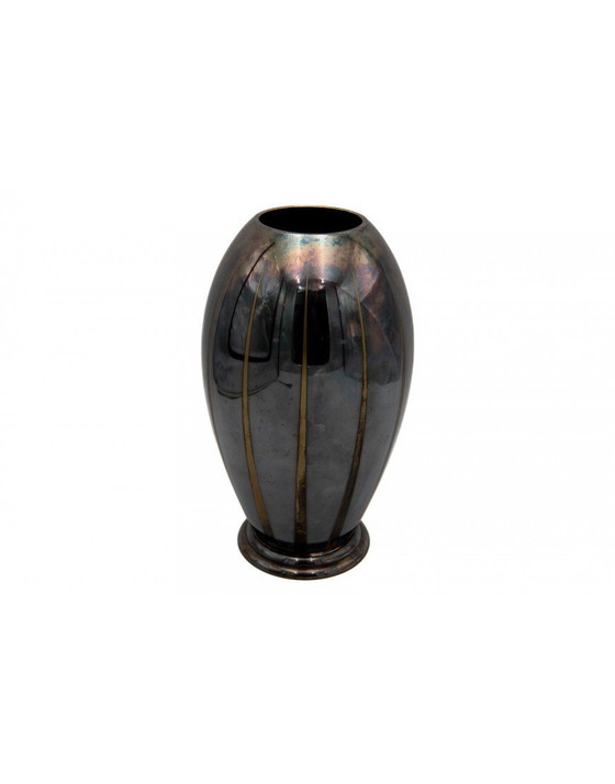 Elegante jarrón plateado de la fábrica alemana WMF. Patrón Ikora, diseñado en la década de 1930. Estilo Art Déco clásico. Buen estado con ligeras abrasiones en el esmalte.