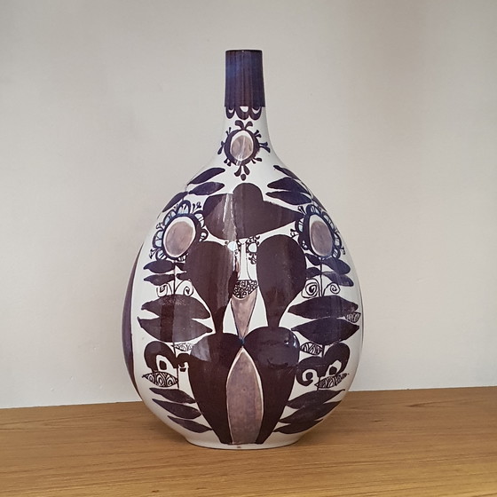 Jarrón botella de porcelana danesa de mediados de siglo de Royal Copenhagen, diseñado a principios de la década de 1960 por el artista danés Nils Thorsson para Royal Copenhagen Fajance y parte de la serie "Tenera". La decoración y el patrón de esta pieza en particular de Tenera fueron diseñados por Kari Christensen. El jarrón está hecho de arcilla de porcelana pintada a mano por ambos lados con un caprichoso motivo floral y una figura femenina con un gran sombrero parcialmente oculto entre las flores. El jarrón está esmaltado en morado claro, azul claro y marrón sobre fondo blanco. El jarrón está marcado con el número de artículo 170/2740, junto con la marca Aluminia de Royal Copenhagen Denmark y la marca del artista KC. El jarrón en forma de botella mide aproximadamente 16,5 cm de ancho y 10 cm de profundidad y mide 28 cm de alto. Está en perfecto estado.