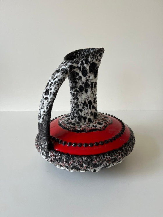 Descubra el encanto único de este jarrón de cerámica Schlossberg, un hermoso ejemplo de diseño vintage. Con su impactante textura de lava y su vibrante paleta de colores en negro, blanco y rojo, este jarrón es un verdadero punto de atracción que transforma cualquier espacio.
