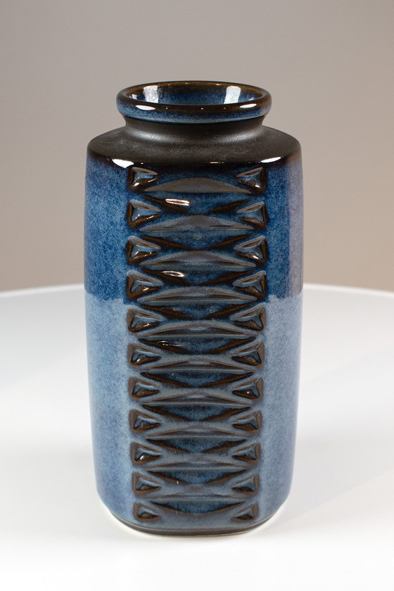 Jarrón Søholm, modelo 3346, diseñado por Einar Johansen en la década de 1960. El jarrón es recto (en la foto parece ligeramente convexo) y presenta varias esquinas. El relieve, combinado con el esmaltado azul, lo convierte en un jarrón único. En buen estado vintage.