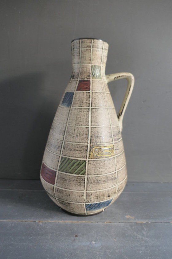 Este jarrón Spara vintage de Alemania Occidental es una pieza que sin duda llamará la atención en tu hogar. Con sus 43 cm de alto y 23,5 cm de diámetro, es perfecto para exhibir tus flores favoritas o simplemente como elemento decorativo. El jarrón presenta un estampado geométrico único y colorido que aporta un toque alegre a cualquier estancia.