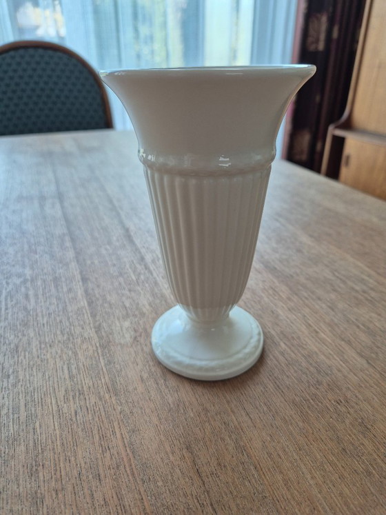 Jarrón color crema de Wedgwood o Etruria & Barlaston, en perfecto estado. Presenta un diseño acanalado. En la base lleva la inscripción «Wedgwood Etruria Barlaston Made in England Edme USA Des. Pat. 61298».