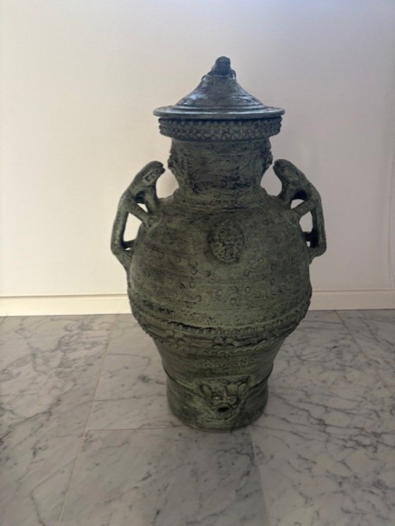 Este impresionante jarrón XL, de 65 cm de alto, es una obra maestra de artesanía y expresión artística.
