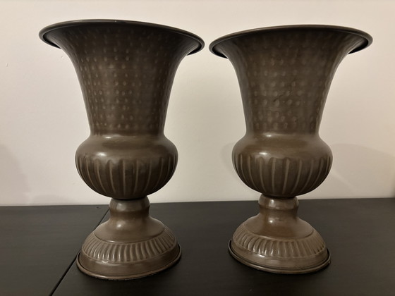Estos elegantes jarrones de metal claro presentan un diseño clásico con una superficie texturizada y un intenso color marrón. Son perfectos para añadir un toque de sofisticación a cualquier estancia. Versátiles para varios estilos de decoración, estos jarrones son ideales para exponer flores o como piezas decorativas independientes. Su robusta construcción de metal garantiza su durabilidad, convirtiéndolos en un complemento atemporal para la decoración de su hogar. Base protegida con terciopelo.