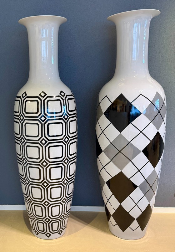 Dos jarrones Pols Potten. Porcelana esmaltada con motivos geométricos en blanco y negro. Se trata de un juego de dos, pero también se pueden comprar por separado. El precio es por jarrón.