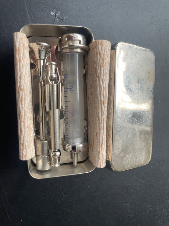 Jeringa de vidrio reesterilizable de 2 ml, con estuche metálico y mandril para destapar la aguja. El estuche metálico proporciona protección durante la reesterilización. Nueva, sin usar.