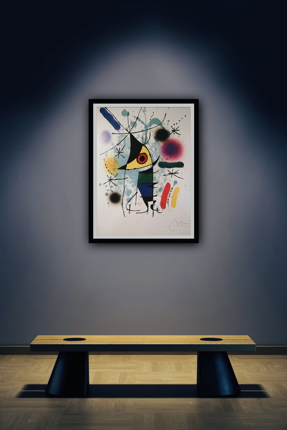 Joan Miró: “Home de festa, 1972”. La firma y otras anotaciones están impresas en una placa. Papel satinado grueso. Sellos de autenticidad y procedencia de la sala en el reverso. Los derechos de autor y el pie de página legal de la serie están autorizados bajo la licencia SIAE. Descripción detallada: Imagen "El pez cantor" (1972). En 1972, a los 79 años, Miró creó una serie de litografías en color para su catálogo razonado "Litografía I". El mundialmente famoso motivo "El pez cantor" es uno de los más bellos. En esta obra, Miró interpreta el mar y su vibrante vida con su estilo característico. Fibras sinuosas y líneas flotantes culminan en "El pez cantor". Esta litografía offset a color nunca se ha enmarcado y se ha conservado en un entorno de archivo oscuro, entre papel protector libre de ácido. Las fotografías que se muestran forman parte de la descripción; el marco (tamaño) mostrado es solo para fines ilustrativos y no está incluido. Esta obra se empaquetará cuidadosamente y se enviará en papel protector libre de ácido. Si tiene alguna pregunta, por favor, contacte con Daniel por mensaje.