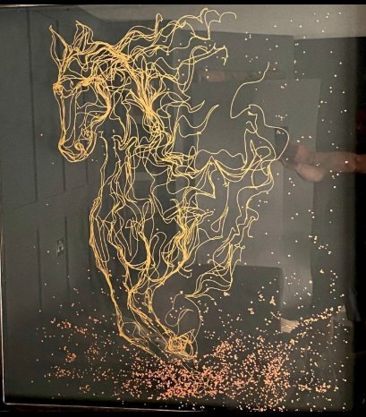 "Caballo Salvaje" es una obra del artista del noreste Jonathan Antony Barber. Esta es una oportunidad única para adquirir una de las dos pruebas de artista de "Caballo Salvaje", que presenta una elocuente representación de un purasangre a todo galope. Una pieza aclamada por la crítica. La obra está serigrafiada en oro metálico y cobre directamente sobre el más fino vidrio puro bajo en hierro (1210 x 1000), con un robusto marco de acero y a aproximadamente 60 mm de la pared. La atmósfera de la habitación y la luz influyen drásticamente en la perspectiva de la imagen. La tinta metálica puede ser impactante y a la vez tridimensional. Se incluye un certificado de autenticidad que se entregará. Se recomienda recoger la obra usted mismo. La obra pesa 35 kg y se instala fácilmente entre dos personas.