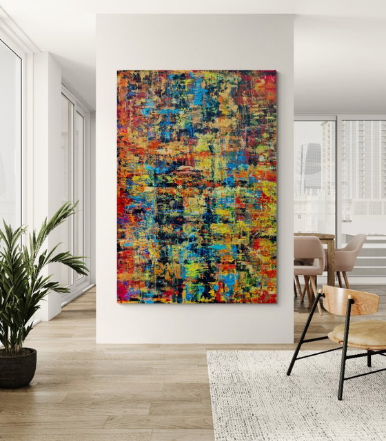 En esta obra, dejé fluir mis emociones más profundas, permitiendo que colores intensos y pinceladas potentes se entrecruzaran en una danza dinámica. El caos crea una sensación de armonía. Esta pintura evoca bienestar y relajación. Cada mañana, al contemplar esta pintura, su día será más hermoso. "Feel good today" está pintada con espátula, pintura acrílica y la técnica de goteo de la pintura de acción sobre lienzo XXL. La pintura se aplica de forma expresiva y dinámica al lienzo. Español Barnizado e incluye un certificado de autenticidad. El dinamismo, la expresión y la libertad de la expresión artística del artista son claramente visibles Obra expresionista abstracta original y muy única del artista profesional / contemporáneo holandés (desde principios del año 1980) Jovan Srijemac (1962). ..Esta obra encaja bien en un interior moderno o espacio de oficina. La condición del trabajo es excelente, barnizada, con certificado de autenticidad El caos de ideas que han surgido en mi cabeza, la energía robada interna, quiere salir como un volcán y así se convierte en una explosión y una sinfonía de colores en el lienzo, enmarcada con materia, figuras, rostros o una composición abstracta. De la aplicación inconsciente, a menudo caótica y explosiva de pintura en el lienzo, surgen: al principio figuras, objetos, retratos o una composición abstracta no planificados. Como con la concepción no planificada de un niño: nacimiento, crecimiento, formación de la personalidad y su vida. Muchas veces concebidos sin planearlo, nacemos, crecemos y todos estamos enmarcados en el cuerpo, nuestro marco, pero cada uno es único a su manera.
