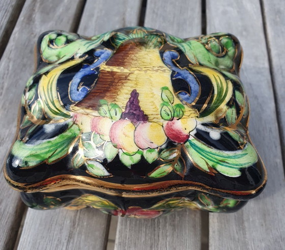 Bonita caja de cerámica pintada a mano con tapa, típica del lujoso estilo de Hubert Bequet (Quaregnon, Bélgica), profusamente decorada con motivos florales sobre fondo negro y rematada con detalles dorados.