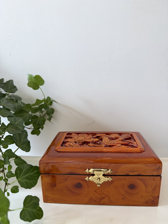 Precioso joyero vintage con un cálido acabado en madera brillante y una delicada talla en la tapa que representa flores y un pájaro. El interior está forrado en tela roja y cuenta con compartimentos para anillos y joyas. Q48