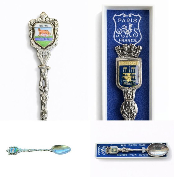 Juego de 12 cucharillas de plata .800 con escudos esmaltados que conmemoran París (Notre Dame), Roma, Pescara, Bellinzona, Selvino, Orvieto, Grado, Bolonia, Lago de Garda, San Vicente, Aosta y Varazze. Fabricadas en la década de 1950, en excelente estado. Longitud aproximada: 10 cm, peso aproximado: 11 gramos.
