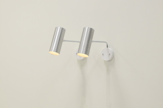 Juego de 2 apliques de pared Raak Amsterdam, años 60, Países Bajos. Modelo C1582-37. Tubo de aluminio cepillado sobre un brazo de metal cromado con soporte de pared de metal blanco. La lámpara es ajustable y puede orientarse en cualquier dirección. Admite una bombilla E27. Las piezas blancas han sido restauradas. Disponemos de 10 unidades en stock. En muy buen estado de conservación, restauradas. Medidas: – Alto: 20 cm – Ancho: 10 cm – Fondo: 37 cm