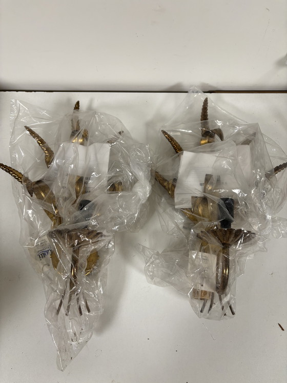 Lleve la elegancia atemporal del estilo Hollywood Regency a su hogar con este hermoso juego de dos apliques de pared nuevos chapados en oro. Esta pieza no es solo vintage; es New Old Stock (NOS). Esto significa que la lámpara fue producida hace décadas por el renombrado Grupo Lotti (Lampadari Fiorentini), pero nunca se ha utilizado. Por lo tanto, se encuentra en perfecto estado y con la etiqueta original aún adherida.