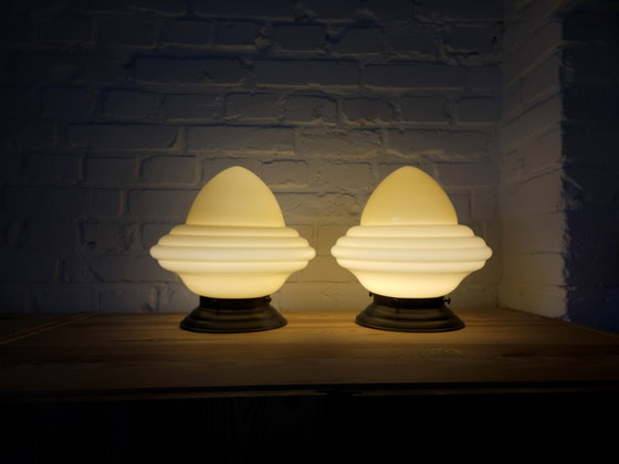 Un conjunto especialmente elegante de dos lámparas de techo Art Déco amarillas. Estas lámparas clásicas tienen apliques de cobre, cada uno con casquillo E27. Las hermosas pantallas de vidrio amarillo llaman la atención de inmediato. El vidrio opalino permite el paso de más luz en algunas zonas y menos en otras. Estas lámparas son perfectas para un interior clásico, pero también para un pub tradicional. El precio indicado es por el conjunto de dos. Dimensiones: Alto: aproximadamente 24 cm. Diámetro: aproximadamente 22 cm. Diámetro de la base: aproximadamente 16 cm. Las pantallas de vidrio están en buen estado. Uno de los dos apliques de cobre presenta algunas grietas y un pequeño desgarro (ver foto 8).