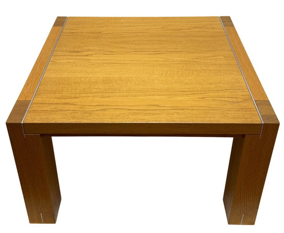 Las mesas están fabricadas en roble macizo claro y rematadas con unas exclusivas franjas de metal claro en el tablero y las patas, un detalle habitual en muebles de diseño holandés de alta gama.