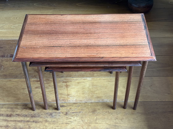 Este conjunto de tres mesas auxiliares de la década de 1960 es un bello ejemplo de diseño danés. Las mesas son elegantes y funcionales, perfectas para cualquier salón. Se pueden apilar fácilmente para ahorrar espacio y son ideales para servir bebidas o exponer objetos decorativos. Los tonos cálidos de la madera y su elegante diseño las convierten en un complemento atemporal para su interior.
