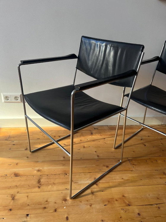 Las sillas cuentan con una esbelta estructura de metal tubular cromado, un respaldo ligeramente curvado y un asiento de madera curvada, tapizado en cuero negro. Los reposabrazos lacados en negro presentan una hermosa pátina natural que armoniza con su estilo vintage. La altura de los reposabrazos es de 63 cm.