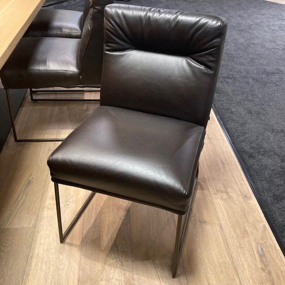 Conjunto de 4 sillas y banco de comedor KFF D-light. La estructura metálica del D-Light conforma un conjunto de silla y banco de comedor extremadamente cómodo, diseñado por Steven Schilte para la marca alemana KFF. Esta silla combina la comodidad de un sillón con la estética de un banco de comedor, creando una elegante transición entre sentarse y relajarse. Su amplio tapizado garantiza la máxima comodidad; además, la silla es ligera y, a pesar de su aspecto robusto, no ocupa mucho más espacio que una silla convencional. El banco de comedor también se puede adquirir por separado. 4 sillas de comedor: 65 x 52 x 89 cm (alto), altura del asiento 43 cm. Desde 4304 € hasta 3100 €. Banco: 192 x 65 x 89 cm (alto). Desde 3746 € hasta 2690 €. Tapizado en piel Dakota M11, color marrón oscuro. Ligeras marcas de uso en la parte inferior de la estructura.