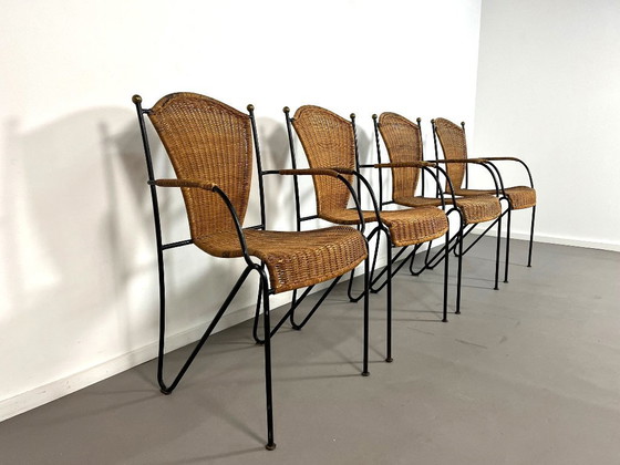 Juego de 4 sillas de hierro con asiento y respaldo de mimbre, década de 1960.