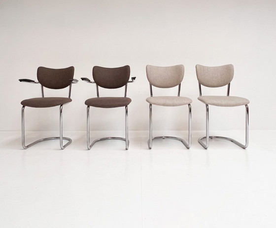 Un hermoso juego de cuatro sillas Toon de Wit con estructura tubular de la década de 1960. Estas cómodas sillas flotantes tienen interiores nuevos y están retapizadas (Richwool by Keymer). Dos sillas tienen tapizado en color crema, mientras que las otras dos tienen un cálido tapizado marrón. Las sillas marrones tienen reposabrazos (uno de ellos ha sido reemplazado) y tapas de suelo. La estructura presenta una ligera pátina que realza su carácter. ¡Una silla atemporal y popular con un aspecto renovado! Número de piezas: Este juego es único y solo hay una unidad en stock.